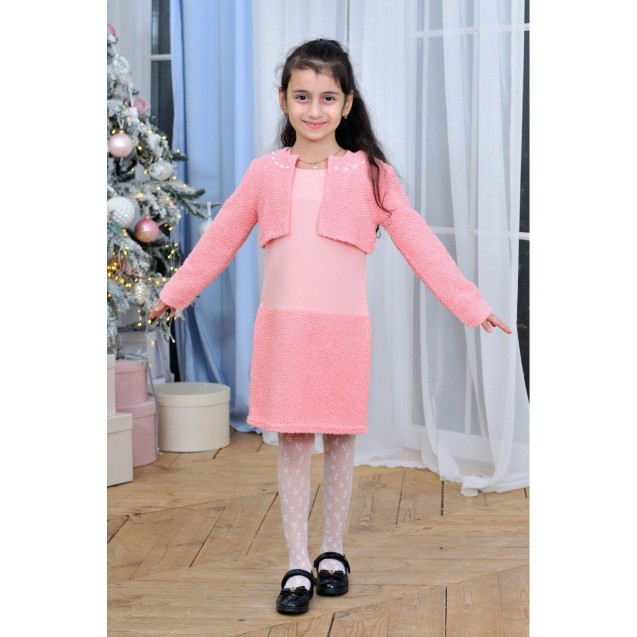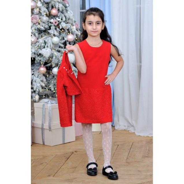 Сумочка в комплекте.Прямое платье без рукавов, сзади застежка-молния.Болеро на подкладке с декоративной отделкой.